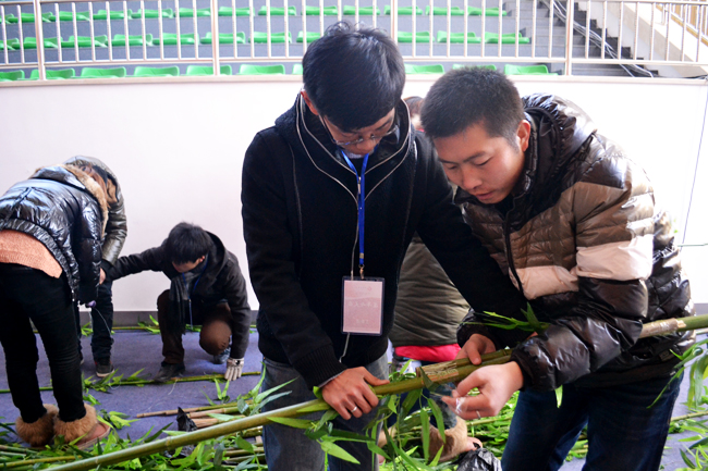 青脆的竹葉是志愿者一個一個粘到竹竿上的