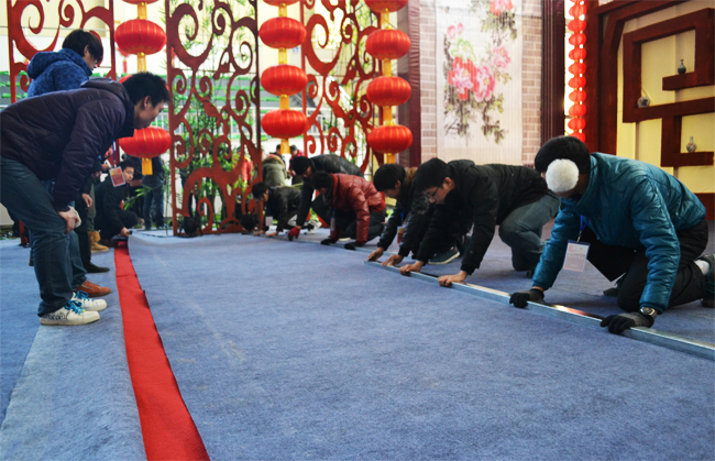 細節(jié)無處不在——志愿者悉心平整、粘合舞臺地毯