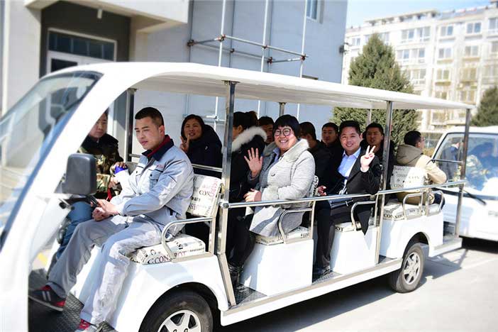 即將入職的區(qū)域經理和店面經理乘坐觀光車參觀康姿百德自動化生產線