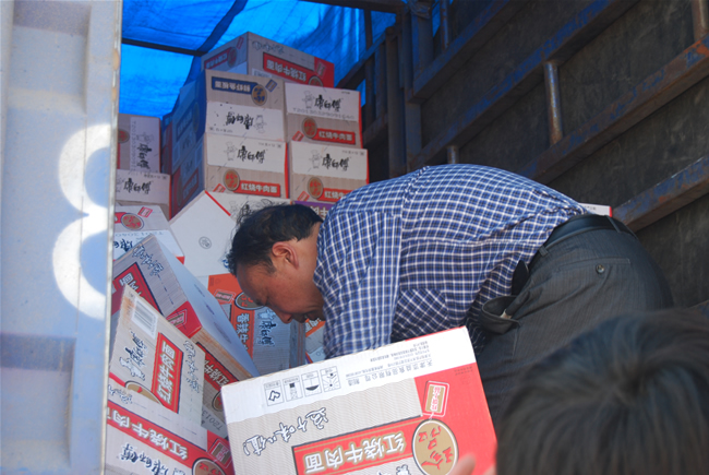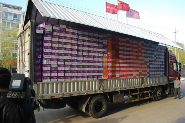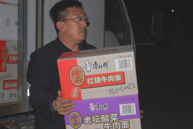 25日凌晨三點,康姿百德救災物資車隊到達北京。房山康姿百德總代理李三喜,代表延慶、通州、門頭溝、密云、昌平、景山、唐山、延吉、廊坊以及華夏經典等地的代理商將愛心物資裝上貨車