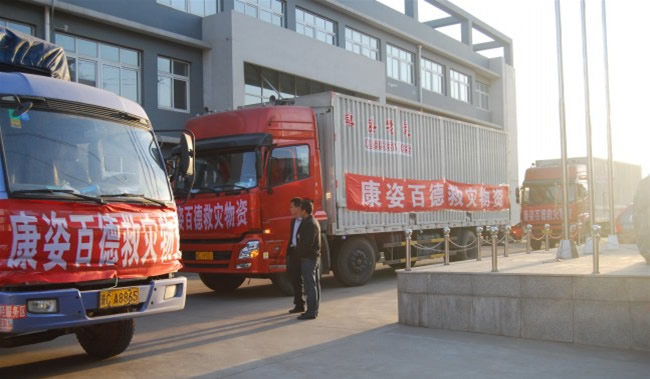 滿救災物資的貨車離開康姿百德公司,駛向災區 “捎去我的愛心,帶上我的祝?!?/strong> “回饋社會,造福人類”,始終是康姿百德公司秉承的經營理念。全國各地的康姿百德經銷商在把幸福和健康帶給人們的同時,也深知自己身上的責任,不忘奉獻自己的愛心。他們積極捐款捐物,向災區人民伸出援助之手。物資車途經北京、河北、山西、河南等地時,當地經銷商囑咐司機一定把這份愛心物資安全送到災區, “捎去我的愛心,帶上我的祝福”,這是康姿百德人最強烈的心聲。