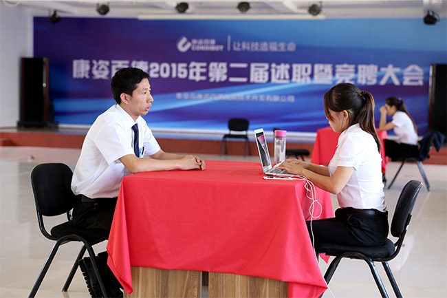 “我參加工作以來一直從事行政管理相關的工作,對公司日常行政管理工作有更深的理解,這個是我競聘行政主管的優勢……”7月2日,在康姿百德科技園辦公樓三樓會議室,參加康姿百德2015年第二屆述職暨競聘大會的行政專員馮璐正在向評審團進行面試答辯。這也是此次競聘大會最為重要的一個環節。