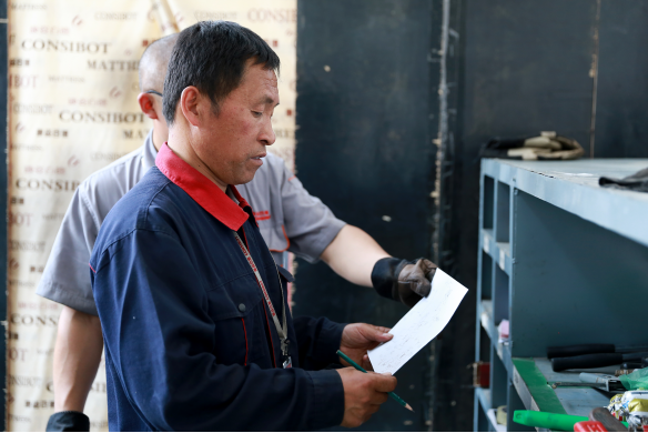 馮國成和同事研究組裝車間頂升設備技術革新