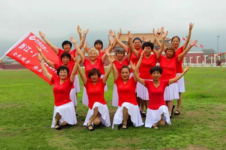 在古建筑恢宏氣勢的映襯下,大家踏著歡快的節拍,律動優美的體姿,用跳健身操的方式表達著對美好生活的向往。