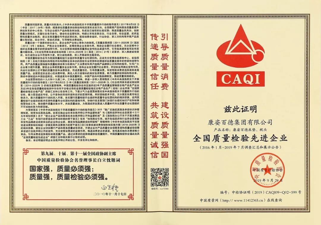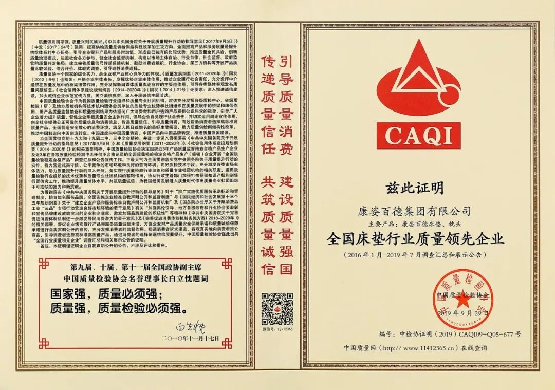 不僅如此,康姿百德還榮獲了“全國床墊行業質量領先企業”、“全國質量信得過產品”、“全國質量檢驗先進企業”、“全國質量誠信先進企業”、“全國質量信用優秀企業”等多項榮譽。