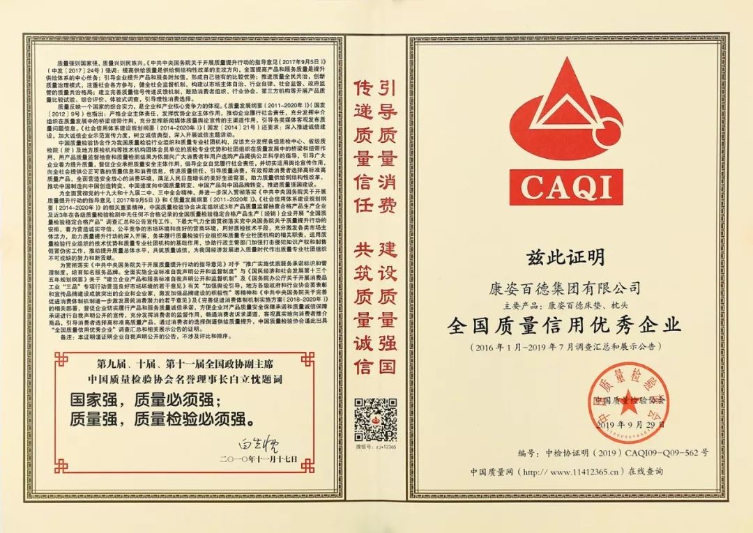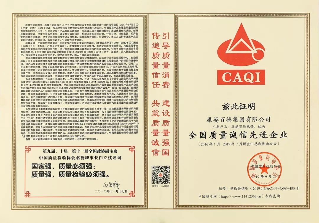 2014年以來,康姿百德集團連續多次被授予“全國質量和服務誠信優秀企業”榮譽稱號。此次榮譽的授予,向廣大消費者提供了權威的質量和消費信息,既保護了誠實守信的企業,又維護了廣大消費者的合法權益,同時,更是對康姿百德一直以來在質量誠信及產品質量方面的肯定。