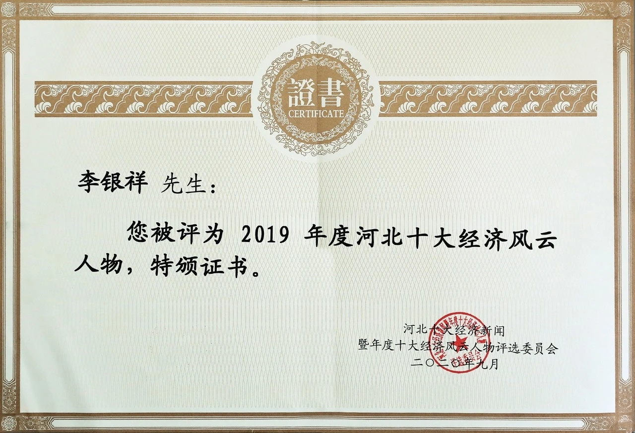 “河北十大經濟風云人物”榮譽證書