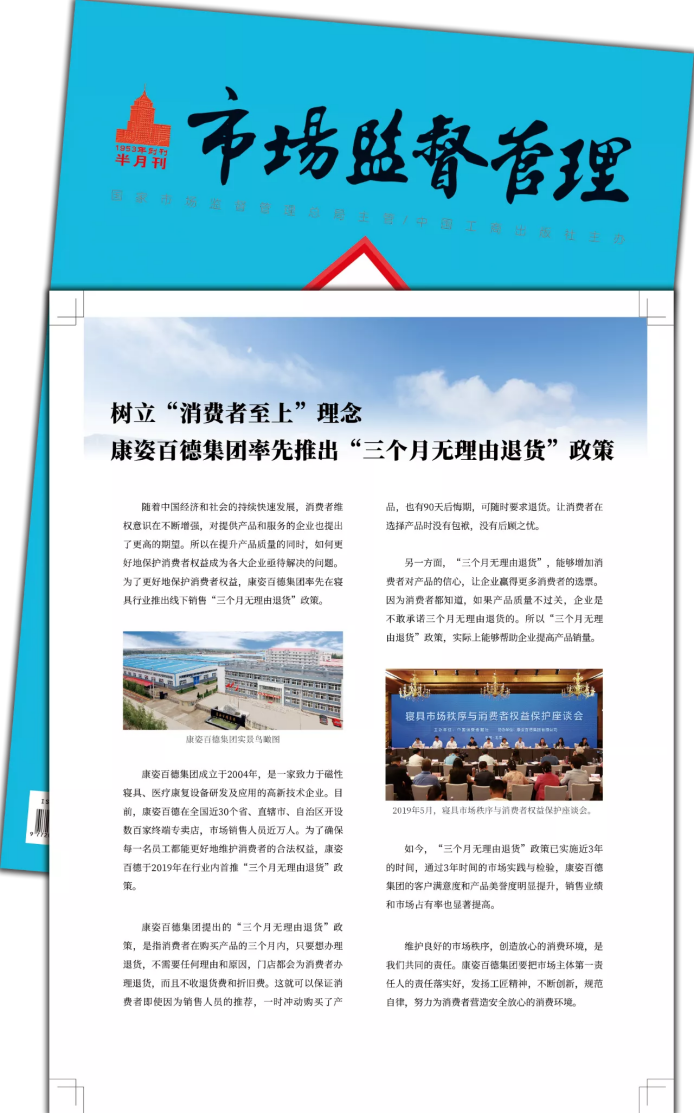 《市場(chǎng)監(jiān)督管理》1953年創(chuàng)刊,前身為《工商行政管理》雜志,曾被新聞出版總署認(rèn)定為雙效期刊,榮獲“第二屆國(guó)家期刊百種重點(diǎn)期刊”稱號(hào)。《市場(chǎng)監(jiān)督管理》雜志專業(yè)、權(quán)威、實(shí)用,在市場(chǎng)監(jiān)管系統(tǒng)內(nèi)有著廣泛而深厚的影響力。康姿百德在消費(fèi)者維權(quán)方面,積極響應(yīng)國(guó)家市場(chǎng)監(jiān)督管理總局的號(hào)召,自主在行業(yè)內(nèi)推行“三個(gè)月無理由退貨”政策,贏得了廣大消費(fèi)者和權(quán)威媒體的肯定與認(rèn)可。
