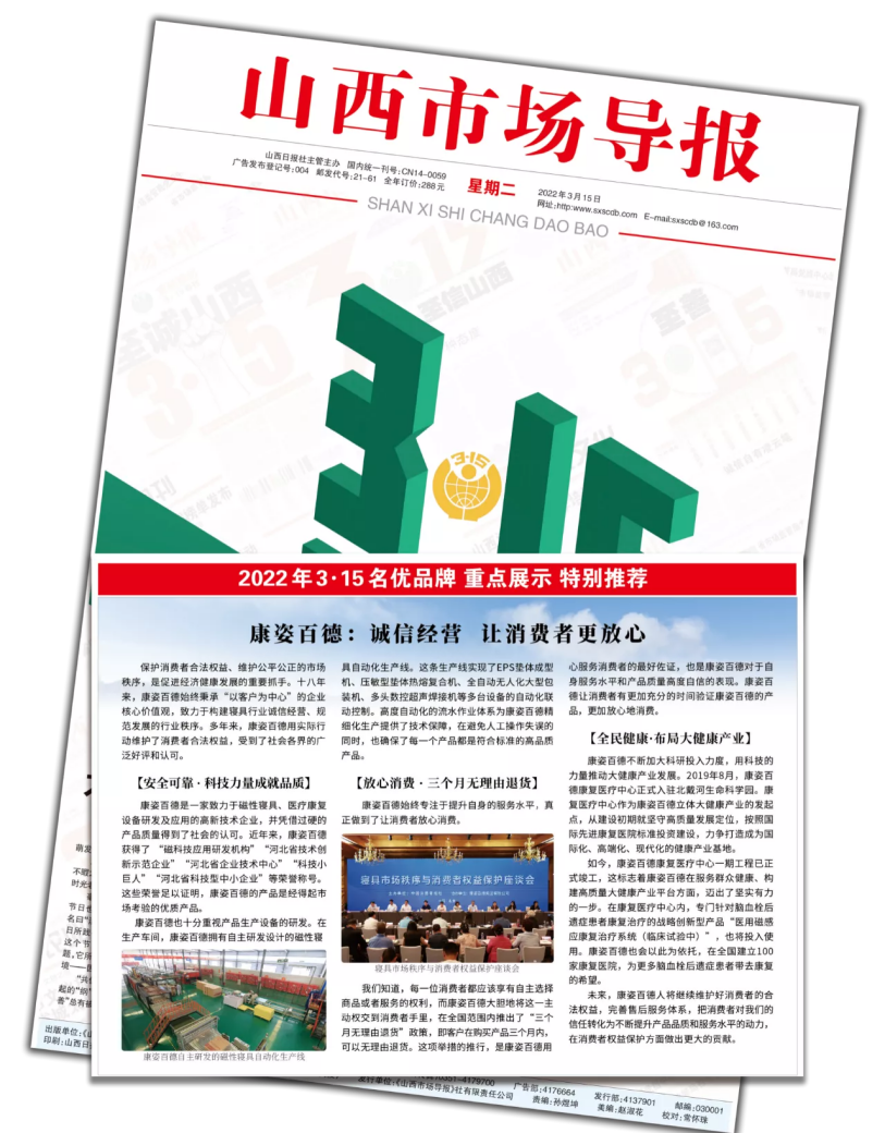 《山西市場(chǎng)導(dǎo)報(bào)》以“康姿百德:誠(chéng)信經(jīng)營(yíng) 讓消費(fèi)者更放心”為主題對(duì)康姿百德的報(bào)道。《山西市場(chǎng)導(dǎo)報(bào)》是由山西省工商行政管理局主管主辦的機(jī)關(guān)報(bào)。