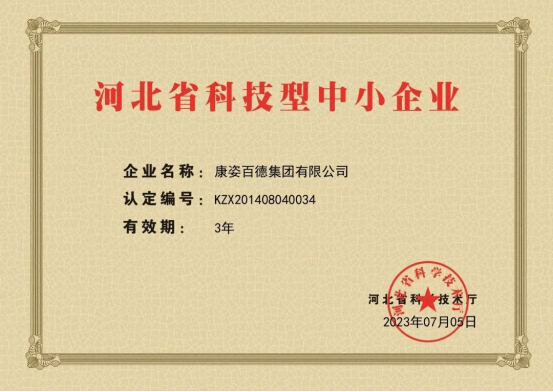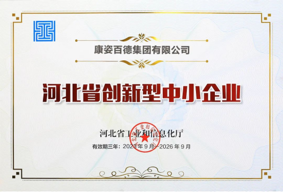 康姿百德集團憑借卓越的創新能力、研發能力和廣闊的市場前景,被河北省科學技術廳評定為“河北省科技型中小企業”。目前已連續13年通過該獎項的評定。康姿百德榮獲“河北省科技型中小企業”稱號,不僅是對康姿百德在技術創新方面的肯定,更是對其在科技研發、成果轉化、企業經營管理等多方面取得的成績的認可。