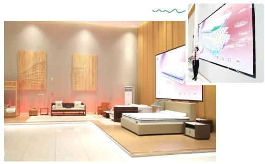 科技展廳安裝了智慧互動屏設備,上下兩個屏幕聯動,小屏控制大屏。用手操作觸控一體機,可放大至穿透產品,實現康姿百德床墊的360°模型展示。全新的互動展示效果,讓參觀人員可以更直觀地了解康姿百德床墊的結構。
