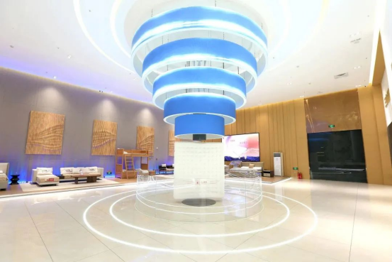 科技展廳的產品展示區,以“科技感”與“舒適睡眠”為設計導向,圍繞“溫暖”“家”“科技”幾個核心元素,實現了科技元素與家居生活的有機結合,構建一個家庭場景式的沉浸空間,一個有溫度的展示環境。