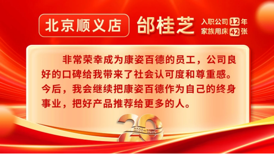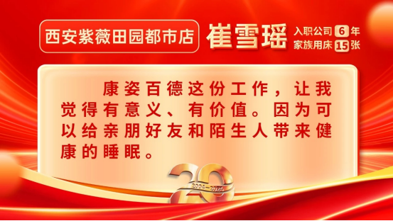 今年是康姿百德集團成立20周年。在20年的發展歷程中,有這樣一群人,他們在市場經營管理過程中,深刻貫徹以客戶為中心的理念,始終把優質的服務融于門店經營的每個環節,也因此得到了客戶的贊賞和認可。他們就是康姿百德專賣店的員工。本期和您分享的是康姿百德北京地區和陜西地區專賣店員工代表的故事。