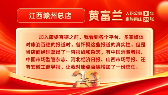 據(jù)黃富蘭回憶,在加入康姿百德時有一個小插曲。“當時是想找份工作,正好看到康姿百德門店在招聘店員,走進去后店面經(jīng)理正給應聘者做企業(yè)介紹,還介紹到了多家媒體對康姿百德進行過報道。當時我看到各個平臺、多家媒體對康姿百德的報道時,曾懷疑這些報道的真實性,擔心是門店作假。店面經(jīng)理看出了我的顧慮,拿出了一沓報紙和雜志,有中國消費者報、中國市場監(jiān)管雜志、河北經(jīng)濟日報、山西市場導報、還有安徽工商導報,讓我對康姿百德增加了一份信任。”