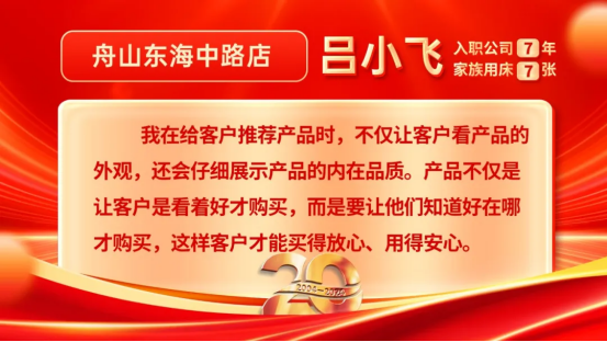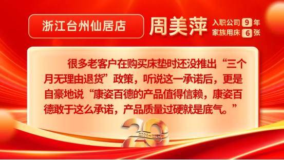 今年是康姿百德集團成立20周年。在20年的發展歷程中,有這樣一群人,他們在市場經營管理過程中,深刻貫徹以客戶為中心的理念,始終把優質的服務融于門店經營的每個環節,也因此得到了客戶的贊賞和認可。他們就是康姿百德專賣店的員工。本期和您分享的是康姿百德浙江地區專賣店員工代表的故事。