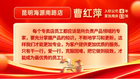 今年是康姿百德集團成立20周年。在20年的發展歷程中,有這樣一群人,他們在市場經營管理過程中,深刻貫徹以客戶為中心的理念,始終把優質的服務融于門店經營的每個環節,也因此得到了客戶的贊賞和認可。他們就是康姿百德專賣店的員工。本期和您分享的是康姿百德云南地區和廣東地區專賣店員工代表的故事。