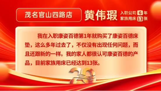 黃偉瑕說道:“我在入職康姿百德第1年就購買了康姿百德床墊,這么多年過去了,不僅沒有出現任何問題,而且還跟新的一樣。我的家人都很認可康姿百德的產品,目前家族用床已經達到13張。我目前最大的愿望就是要讓更多消費者知道康姿百德這個品牌,認可康姿百德,讓康姿百德成為廣東茂名地區有影響力的寢具品牌。”