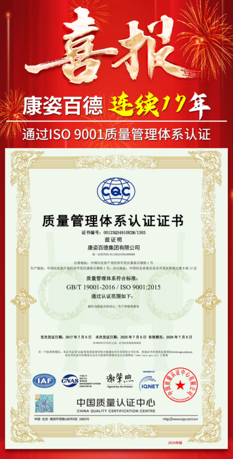 憑借過硬的質量管理實力、完善的質量管理體系、高效精細化的管理模式,康姿百德再次通過了ISO 9001質量管理體系認證。這也是康姿百德連續17年通過該質量管理體系的認證和再認證。