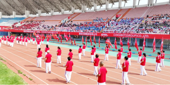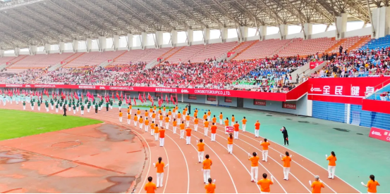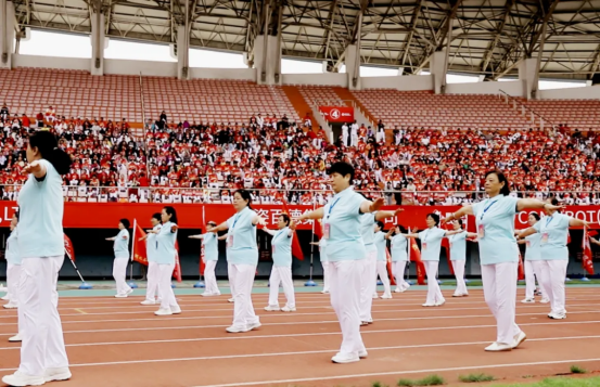 現場82支展演隊伍,浩浩蕩蕩、首尾相連,偌大的體育場瞬時變成一個律動的海洋。參賽隊員各個精神抖擻、熱情高漲,踏著康姿百德健身操音樂節拍,整齊劃一地舞動起來,贏得了全場觀眾的陣陣掌聲。